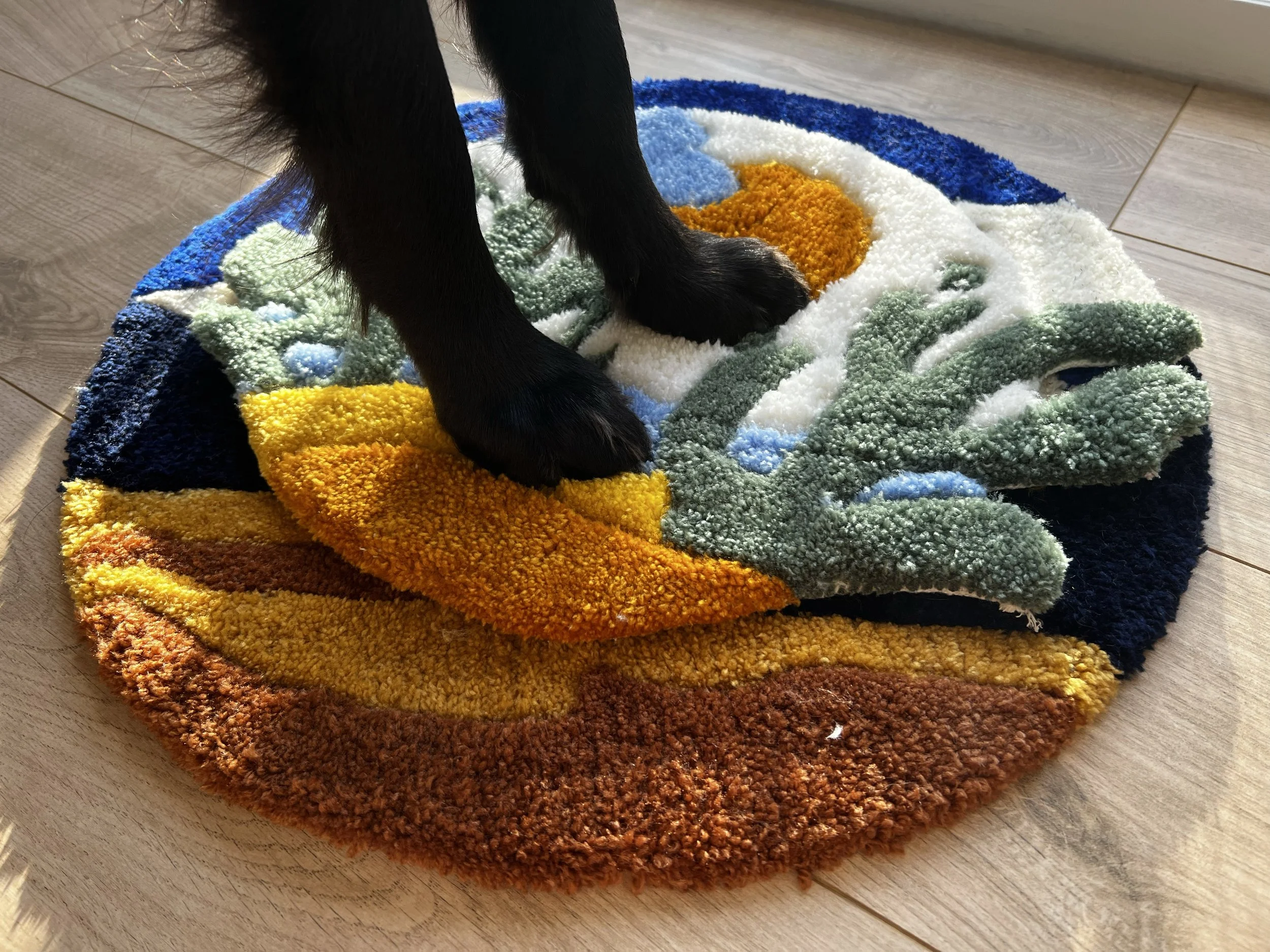 Votre tapis sera fini et encollé à la fin de la session. Je m’occupe ensuite des finitions (tonte, découpe et toile arrière). Vous pourrez venir le récupérer sur place la semaine suivante, ou le recevoir par la poste.